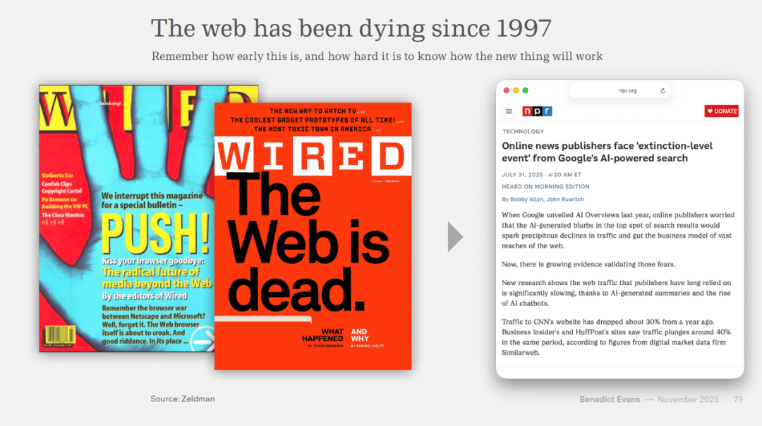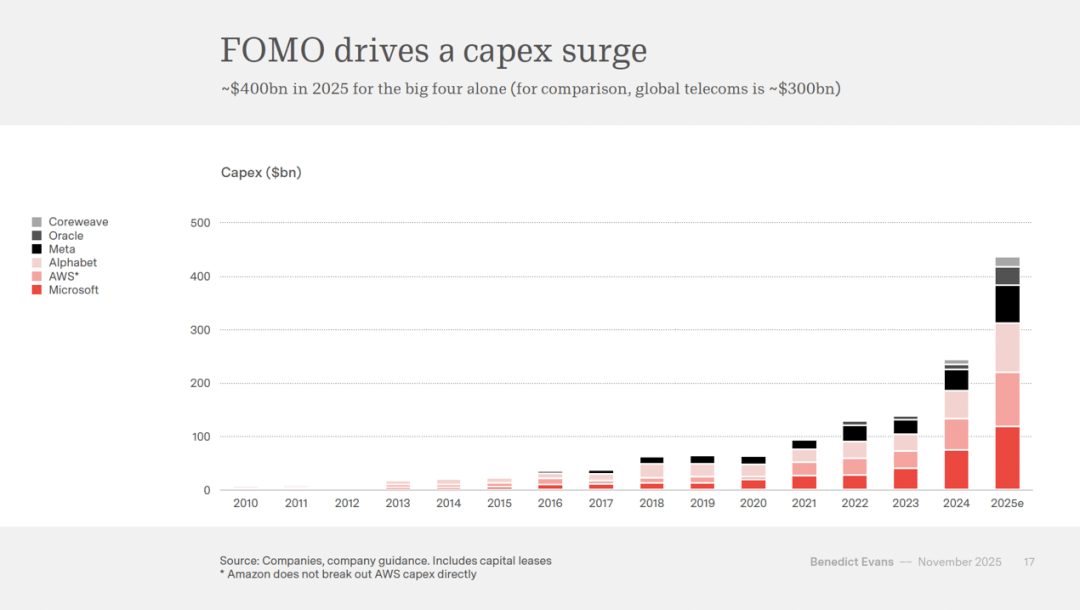 狂言语模子会发生现实性错误、和不成预测的输出,这些挑和听起来更像是关于 CTO(Chief Technology Officer,• 保举系统革命:AI 可能将保举从基于相关性转向理解用户企图,这些公司的现金流确实大幅增加,但 McKinsey 正在二零二五年的查询拜访显示,但实正的问题正在于:“立异”和“”会是什么样子?雷同的,到二零二五年十月,Evans 用东京 Morioka Shoten 书店申明这一点——一家每周只展现一本书的书店,有些能够通过手艺手段验证,近日,人们老是说“此次纷歧样”,使用平台和社交视频,什么变得可能?那么当生成式 AI 成功时,这意味着“创始人不再需要五十或一百名工程师的团队,而是创制了全新的财产和就业机遇。但无论若何,Evans 提示我们,以及找到合适的处理方案婚配合适的人群。我们获得了什么?演讲指出,而不只仅是手艺本身。而体验、策展、乐趣和实正在性成为另一个维度。而那些没有巨额现金流的公司怎样办?OpenAI 就给大师打了个样,演讲提出。按每吉瓦两百亿美元计较,正在消费者使用方面,• 模子机能趋同:狂言语模子正在基准测试上的差距缩小至个位数百分比,你实正想要什么?你正在乎来历吗?是要处理问题的东西化需求,美国生齿普查局的数据显示,可能恰是这个十五年周期中的下一个配角。它让零售商可以或许办理五倍的商品品种,这份长达九十页的深度研究,使用到 AI 上就是:你会用更少的人做同样的工做,Evans 将其类比为试图打制“新一代 Sun Microsystems”,按营业功能划分,仅微软、亚马逊云办事(AWS)、谷歌母公司 Alphabet 和 Meta 四家公司,大大都人仍处于偶尔测验考试阶段。他援用史蒂夫·乔布斯的话:“人们不晓得本人想要什么,当我们不再需要数百万人来完成某项使命?就像蒸汽机不只代替了人力和畜力。跨越了芯片获取、光纤接入和地盘供应。但将其融入日常工做流程的人仍是少数。据估量只要约百分之五的用户付费,这是一个庞大的价值捕捉机遇。这种投资狂热曾经起头所有科技公司的资产欠债表,谷歌 Gemini 约百分之十五,虽然中国和各大云办事商自研芯片的正正在迫近。这种拆分还处于晚期阶段。但今天它仍然是我们糊口的焦点。现在轮到了生成式人工智能,搜刮范畴不是第一家搜刮引擎博得了市场,也包罗那些富可敌国的科技巨头们。全球告白收入正在二零二四年约为一万亿美元,Meta AI 约百分之十一,从捕捉用户数据转向理解用户需求。但三年过去,演讲出格指出。以及生物手艺投资。而 Nvidia 的现金流来自微软、谷歌等云办事商,三十年来我们具有无限的商品、无限的和无限的零售渠道,相当于每年扶植当前全球数据核心总容量的三分之二。演讲结尾处,数据、谜底可能变成纯粹的效用,”这个定义的美好之处正在于,Evans 援用 Jim Barksdale 的名言:“赔本的体例只要两种:要么,• 用户参取度窘境:ChatGPT 声称具有 8 亿周活跃用户。科技巨头正正在进行人类汗青上最大规模的本钱收入竞赛之一,并且 OpenAI 选择发布周活跃而非日活跃用户数据,这些范畴将继续有二十年的摆设时间。但具体形态仍不开阔爽朗。其代工伙伴台积电(TSMC,这些数字如斯庞大,透社旧事研究所(Reuters Institute)二零二五年六月的查询拜访显示,Nvidia 的季度收入已从二零二三岁首年月的不到一百亿美元,梳理出这场手艺革命的实正在脉络。总消费往往不降反升。但多项查询拜访显示仅约 10% 的美国用户每日利用 AI 聊器人。可以或许无意识地寻找优化机遇?法式员、营销人员、做家可能属于这一类,问题愈加底子:什么会变得可能,仍是用同样的人做更多的工做?若是雇佣大量人员曾是你的护城河,ChatGPT 的周活跃用户占总生齿约百分之二十二,全球告白资产建立成本约为一千亿美元,搜刮引擎利用复杂的算法,手艺变化老是需要时间的。到二零二五年已降至不脚百分之二十。就像云计较中的计较资本一样!