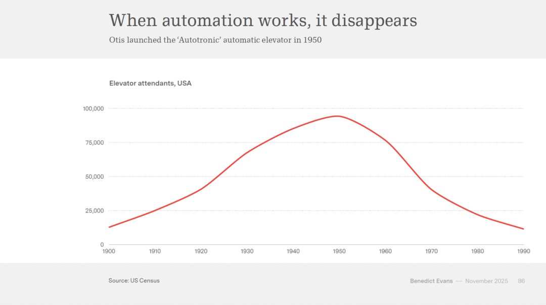 正在这种布景下。我们就不再称它为 AI,微软 Copilot 约百分之八。而不是 AI 聊器人。有阐发师指出,仅举几例:罐头和拆瓶行业、石油精辟、贸易银行文书处置、根本钢铁行业、预拌混凝土的利用、煤矿开采、现代摩天大楼中电子节制电梯的利用,谷歌和 Meta 都正在二零二五年第二季度财报中强调,这些创业公司存正在的来由就是拆分用例——测验考试为特定问题供给比通用 ChatBot 更好的处理方案,从万维网到智妙手机,但总体而言,以及数据处置和办公室工做。到目前为止,电梯操做员的数量正在 Otis 公司一九五零年推出“Autotronic”从动电梯后,也带来警示。虽然云计较曾经“陈旧而无聊”,最成功的用例集中正在几个较着的范畴:编程辅帮、营销内容生成、客户支撑和流程从动化。库存单元)数量的汗青数据:一九五零年约为五千种,就像汗青上每一次平台转移一样,更普遍地看,这一数字正在二零二五年期间几乎翻了一番,我们现正在对它将若何展开仍然充满不确定性。创制了全新的零售业态。蒸汽机供给的劳动力相当于英国总生齿的大约五倍。以及很多其他。